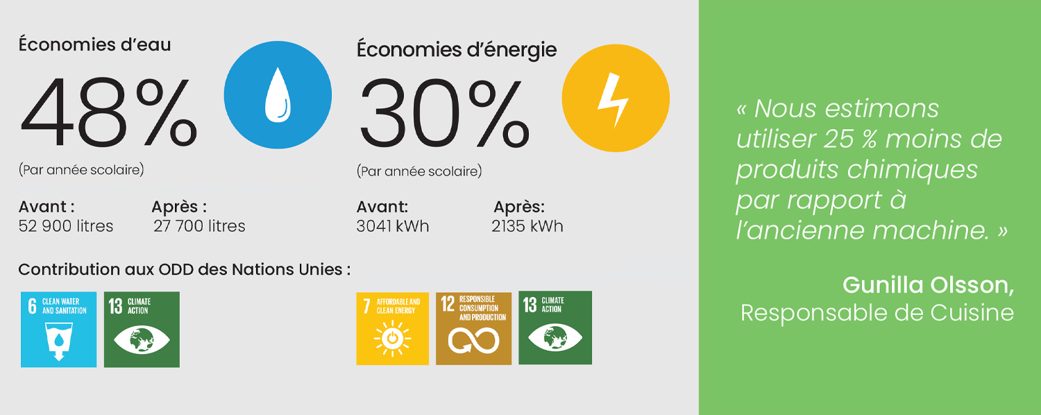 L'étude a révélé une réduction de 48 % de la consommation d'eau, ce qui représente une économie annuelle de 25 200 litres d'eau. Amélioration des conditions de travail grâce à un panier plus facile à charger et à une fonction de nettoyage automatique.