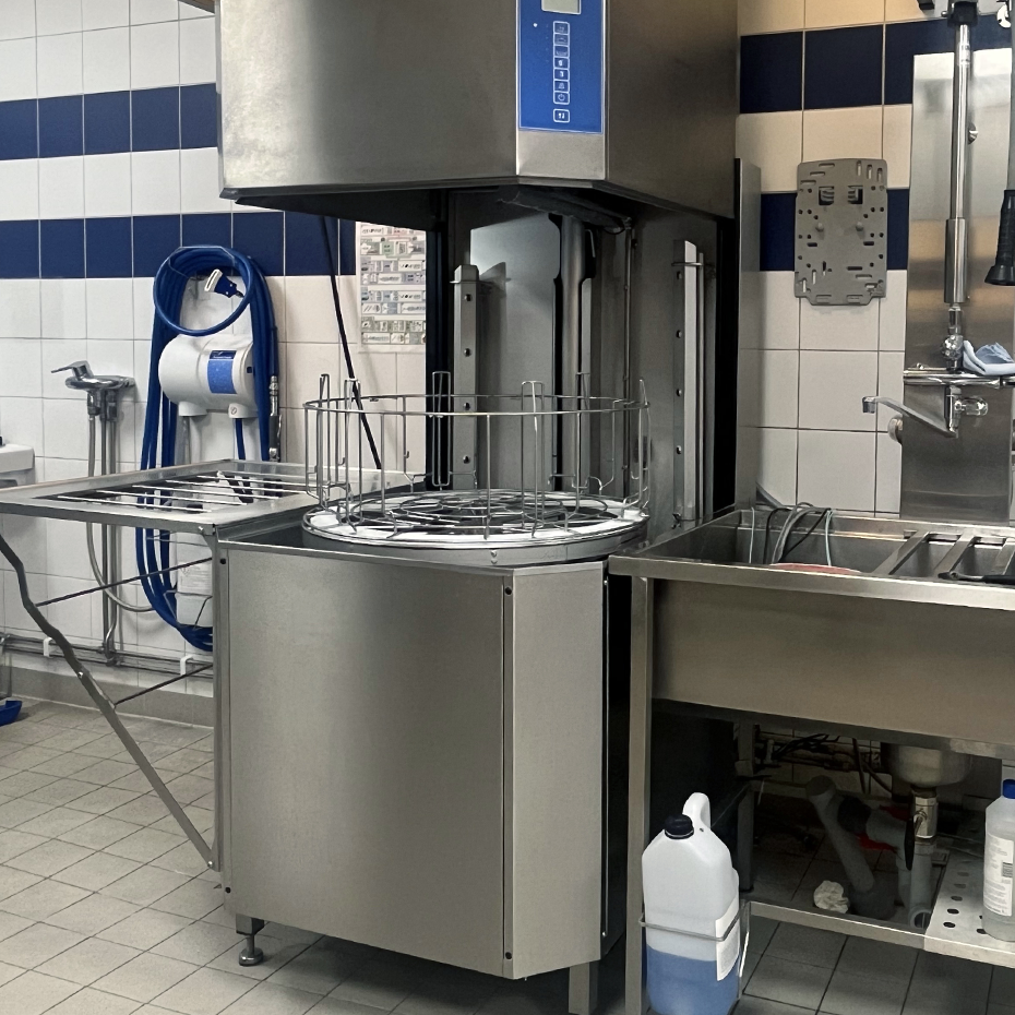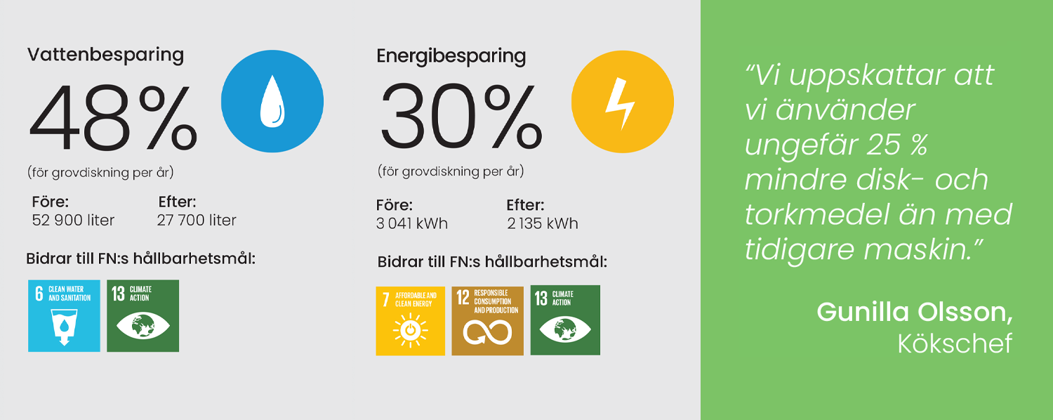 Studien visade på en 48% vattenbesparing, vilket på årsbasis beräknas uppgå till 25 200 liter vatten. Lägg därtill förbättrad arbetsmiljö med enklare lastning av diskkorgar och auto-rengöringsprogram.